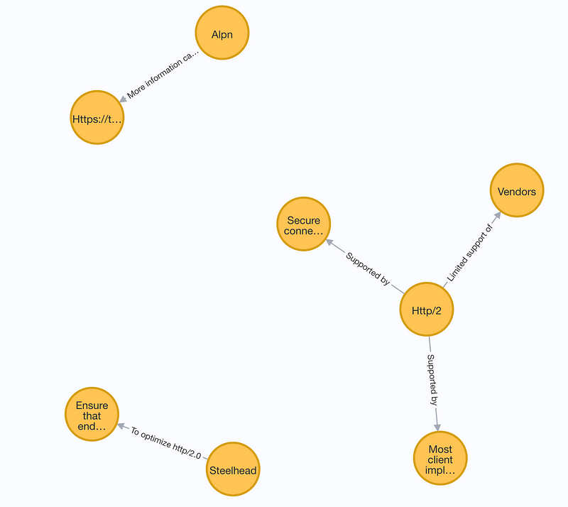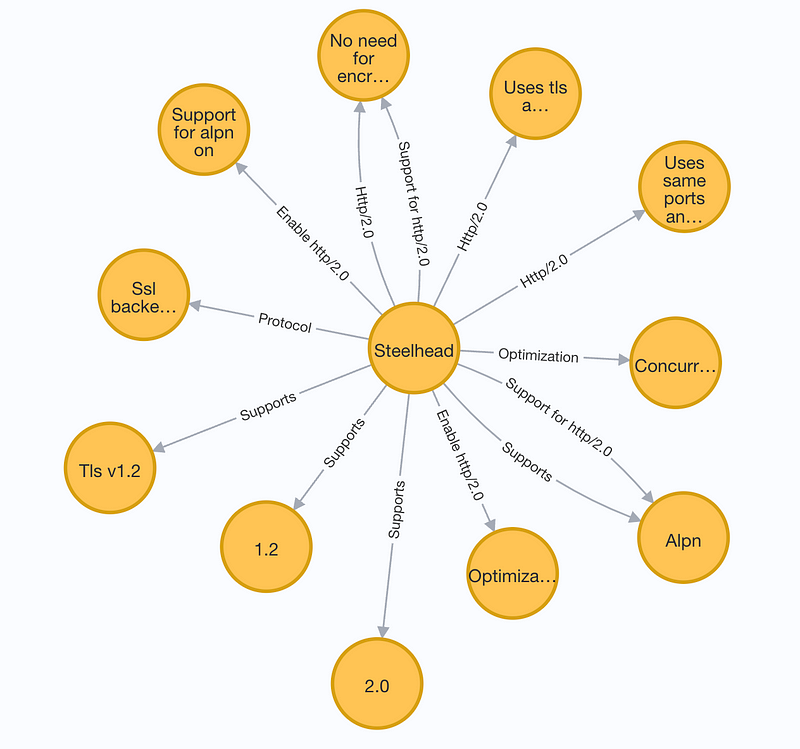 在我们运行上述系统之前,需要首先启动 Neo4j DBMS,并且可以在 localhost 上使用。对于此实验,我们将采用两个单独的关于 SteelHead 的知识库 (KB) 文章(一种与 WAN 应用程序加速相关的技术)来代表我们的利基领域。第一个知识库讨论了一个名为“简化路由”的功能,该功能可帮助设备自动学习并将网络数据包转发到适当的下一跳。第二个知识库讨论了如何在 SteelHead 上启用 HTTP/2.0 加速功能。对于跨两个模型的此测试,使用的图谱构建提示是 LlamaIndex 默认值。