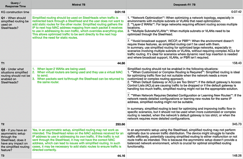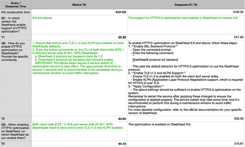 部分的响应,并且必须对响应进行剪辑以限制空间。对于每个查询,最佳响应以绿色突出显示,最短响应时间(以秒为单位)以粗体显示。在一个令人惊讶的发展中,Mistral 7B 对所有三个查询都有简洁而准确的直接答案。Deepseek-R1 的响应细致入微,并详细捕获了不同的场景,但也包括产生幻觉的_事实_。Deepseek-R1 对 Q3 的响应假设 SteelHead 是一种负载平衡解决方案,而实际上它是一种应用程序加速技术。此外,Deepseek-R1 的响应比 Mistral 7B 慢 3.5 倍。甚至它的图谱构建时间也慢了 6 倍以上。