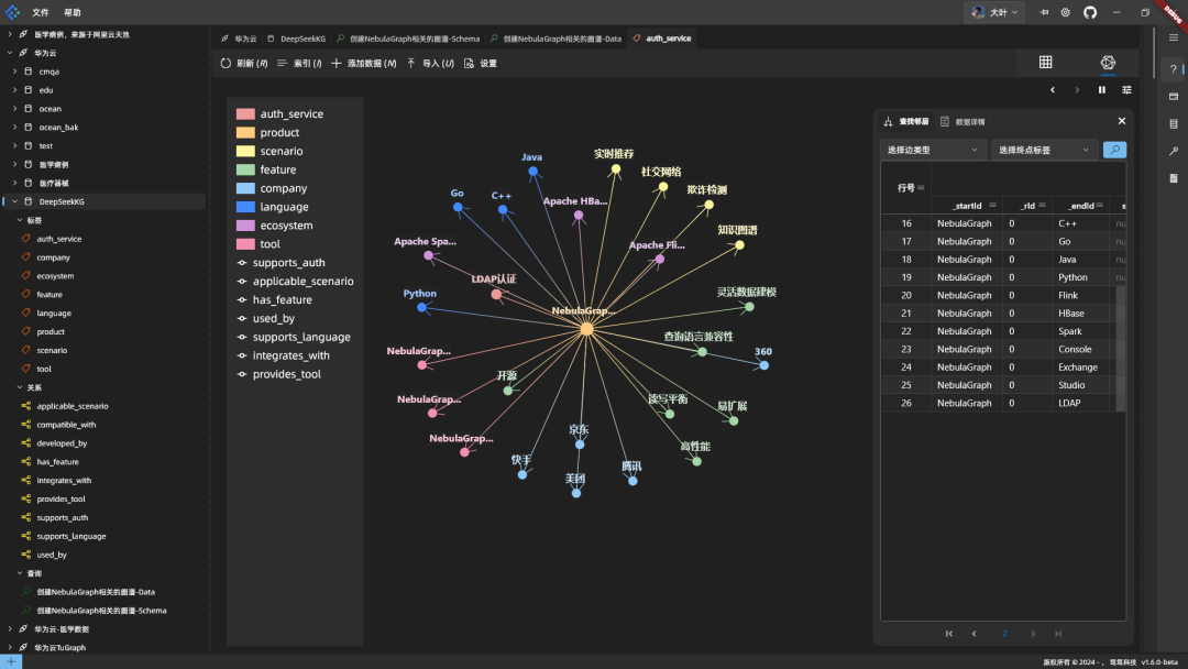 # Schema定义(TAG类型)CREATE TAG IF NOT EXISTS product(name string, description string);CREATE TAG IF NOT EXISTS company(name string);CREATE TAG IF NOT EXISTS feature(name string);CREATE TAG IF NOT EXISTS tool(name string);CREATE TAG IF NOT EXISTS scenario(name string);CREATE TAG IF NOT EXISTS language(name string);CREATE TAG IF NOT EXISTS auth_service(name string);CREATE TAG IF NOT EXISTS ecosystem(name string);# Schema定义(EDGE类型)CREATE EDGE IF NOT EXISTS has_feature();CREATE EDGE IF NOT EXISTS used_by();CREATE EDGE IF NOT EXISTS provides_tool();CREATE EDGE IF NOT EXISTS supports_language();CREATE EDGE IF NOT EXISTS applicable_scenario();CREATE EDGE IF NOT EXISTS compatible_with();CREATE EDGE IF NOT EXISTS supports_auth();CREATE EDGE IF NOT EXISTS integrates_with();# 数据插入 - 核心产品INSERT VERTEX product(name, description) VALUES"NebulaGraph":("NebulaGraph", "开源的分布式图数据库,支持千亿点万亿边数据集");# 数据插入 - 产品特性INSERT VERTEX feature(name) VALUES"high_performance":("高性能"),"open_source":("开源"),"scalability":("易扩展"),"flexible_modeling":("灵活数据建模"),"read_write_balance":("读写平衡"),"compatibility":("查询语言兼容性");/* ... 此处省略 n多数据 */