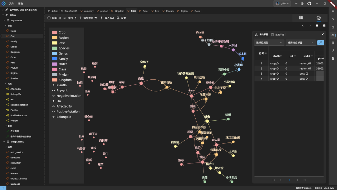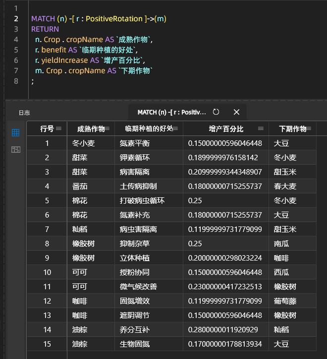 #=======================================# 创建图空间#=======================================CREATE SPACE `Agriculture` (vid_type = FIXED_STRING(32));USE `Agriculture`;#=======================================# 定义标签 Schema(大驼峰命名)#=======================================CREATE TAG IF NOT EXISTS `Crop` (`cropId` int,`cropName` string,`growthPeriod` int,`suitableTemp` string,`yieldPerMu` float);/* 此处省略好多脚本 */