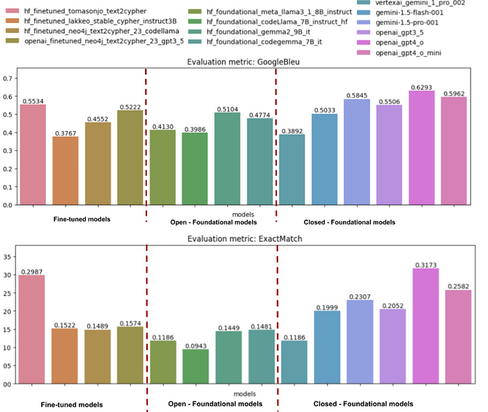 基准测试使用两种指标评估这些模型在生成正确 Cypher 查询方面的表现:Google BLEU(上图)和 ExactMatch(下图)。