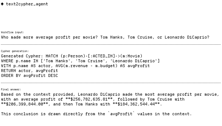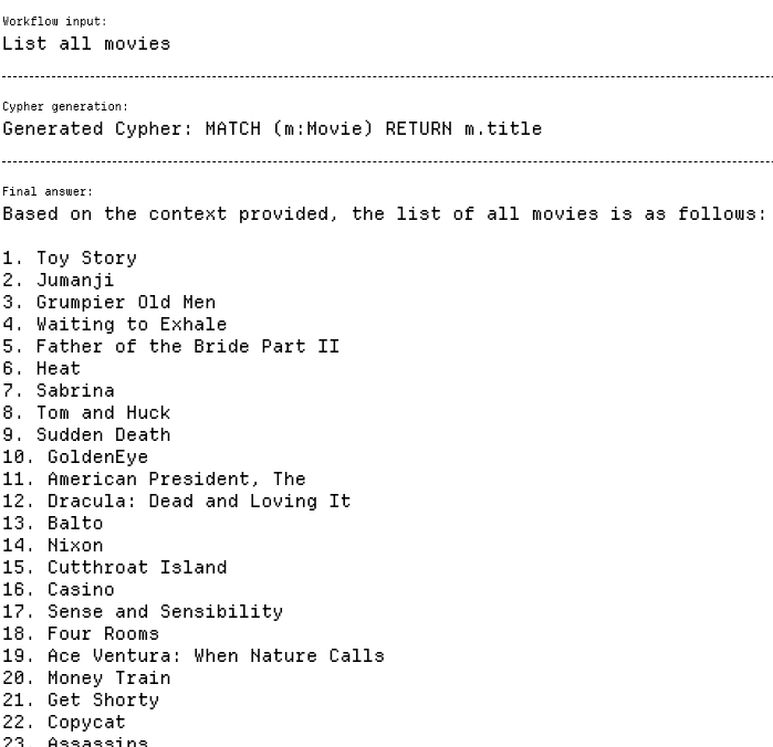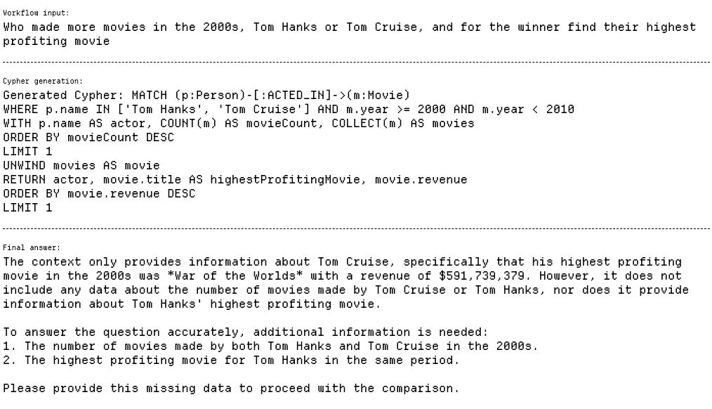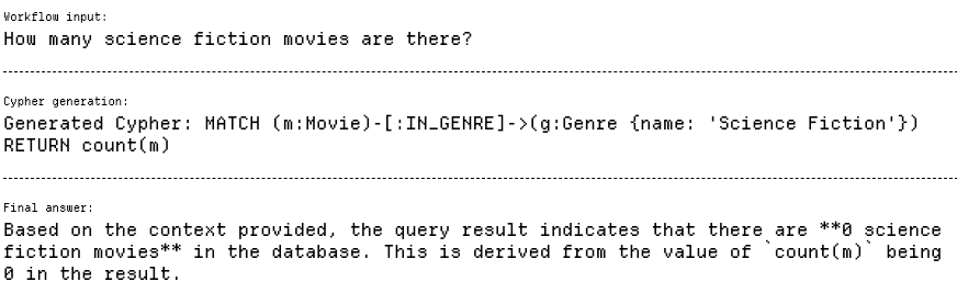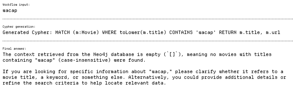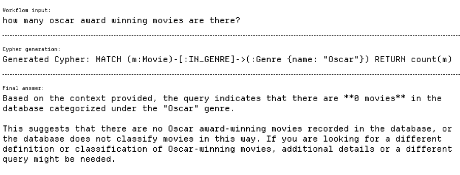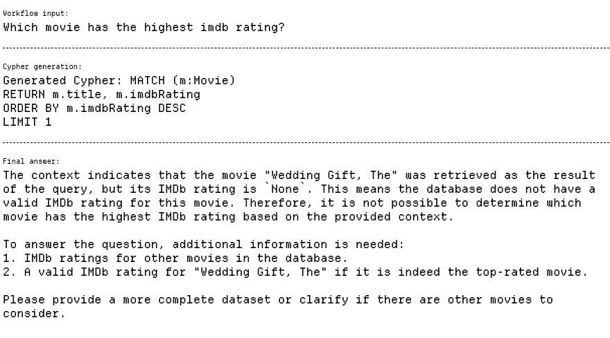函数首先尝试运行查询,如果成功,则将结果传递给后续的总结步骤。然而,如果出现问题,它不会立即放弃,而是检查是否还有剩余的重试次数。如果有,它会将查询连同错误信息一起发送回修正步骤。这种机制创建了一个更容错的系统,能够从错误中学习,就像我们在收到反馈后调整方法一样。您可以查看完整代码和提示词(https://github.com/tomasonjo-labs/text2cypher_llama_agent/blob/main/app/workflows/naive_text2cypher_retry.py)。