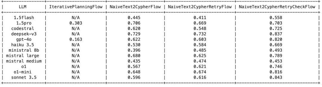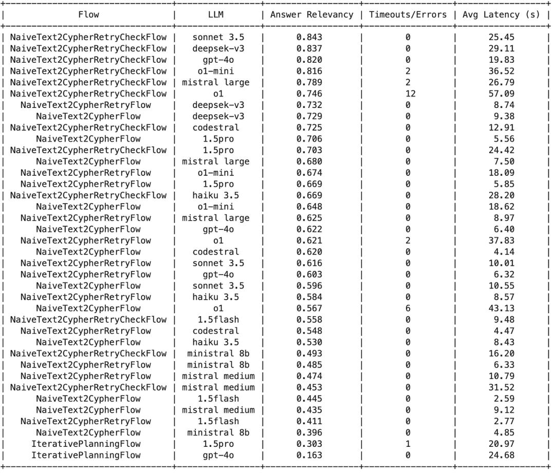 Claude 3.5 Sonnet、Deepseek-V3 和 GPT-4o 成为答案相关性方面的前三名模型,每个模型得分均超过 0.80。NaiveText2CypherRetryCheckFlow 通常产生最高的相关性,而 IterativePlanningFlow 的排名始终较低(最低降至 0.163)。