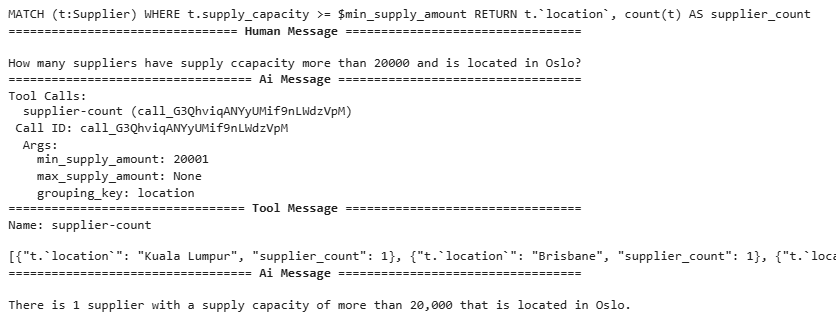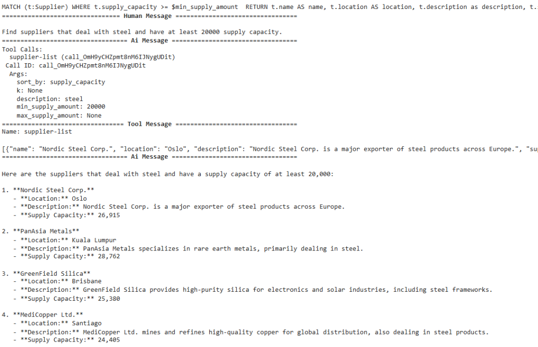 :此工具列出供应商,可选地按供应能力过滤,并按供应能力或其他标准排序。如果提供了描述,则使用Neo4j的向量存储执行向量相似性搜索以找到与描述匹配的供应商。该函数还处理查询的构建并在Neo4j中执行。