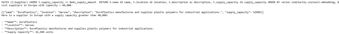 • 结构化+向量结合:如果还提供了其他过滤条件,则它会构建一个Cypher查询,按向量相似性或供应能力排序。