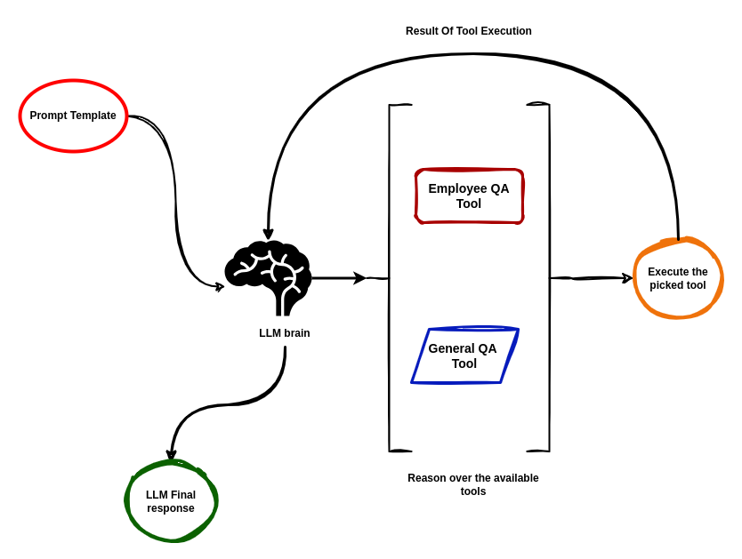 向 AI 智能体提问时,它会选择“员工问答工具”(Employee QA Tool)或“通用问答工具”(General QA Tool)。根据所选工具,AI 智能体将执行相应工具并生成最终答案。