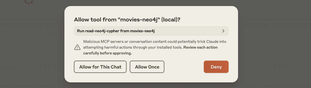 Claude会弹出一个权限对话框,询问我是否允许查询Neo4j数据库(仅限本次或整个聊天会话),如果我接受,它将运行查询并以漂亮的格式返回结果。