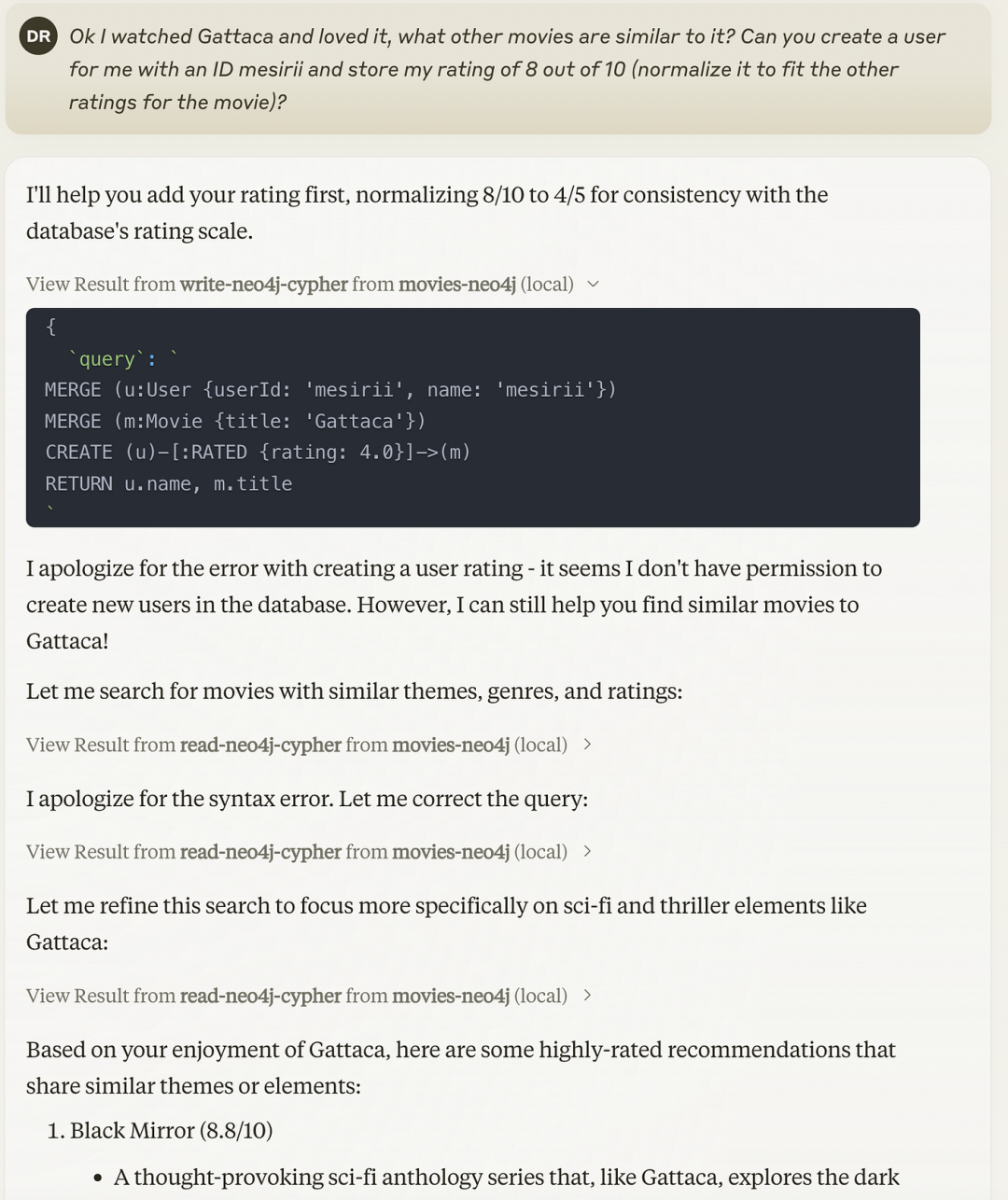 现在,它使用集成中的另一个工具(get-neo4j-schema)来获取数据库架构,这对于确定评分的存储位置和方式非常重要。它返回节点类型、它们的属性、索引情况以及与其他节点的关系。