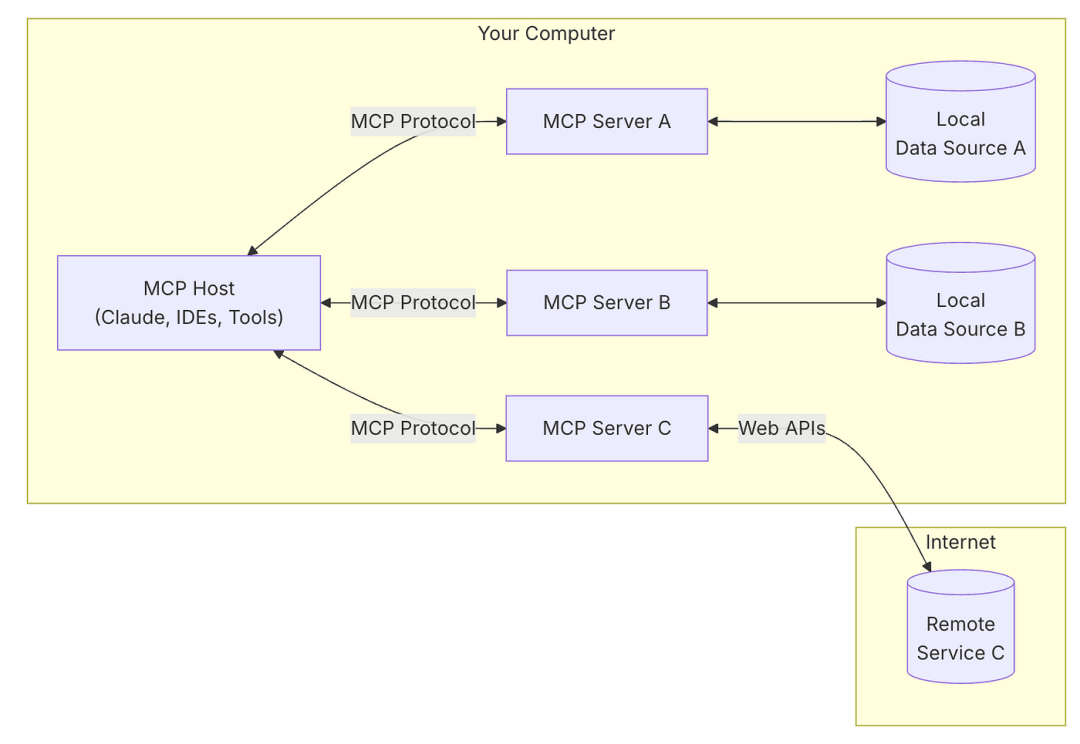 该协议允许本地应用程序(如Claude.ai、Zed、Replit等)在与用户的对话中访问文件系统、API和数据库以获取额外信息。这可以用来回答问题、获取更多信息,或者通过代码生成动态生成图表和可视化内容。