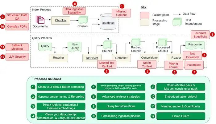 我们探讨了开发 RAG 管道中的 12 个痛点(其中 7 个来自论文,5 个是额外补充)并提供了相应的解决方案。以下是改编自论文《Seven Failure Points When Engineering a Retrieval Augmented Generation System》的图表。