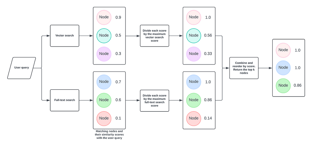 我们可以通过使用 Neo4j GraphRAG Python 库中的 HybridRetriever 类为我们的 GraphRAG 应用使用全文索引。该检索器在一种称为混合搜索的过程中结合了向量索引和全文索引。它使用用户查询同时搜索这两种索引,检索节点及其相应的得分。在对每组结果的得分进行标准化后,它将它们合并,并按得分对组合结果进行排序,返回最匹配的结果。