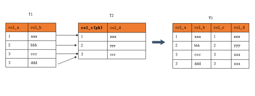 2. 多表视图,是指视图数据映射到多个基表。如下例子中视图v1是由表t1和t2组成,视图v1的数据与t1和t2中数据都存在映射关系。