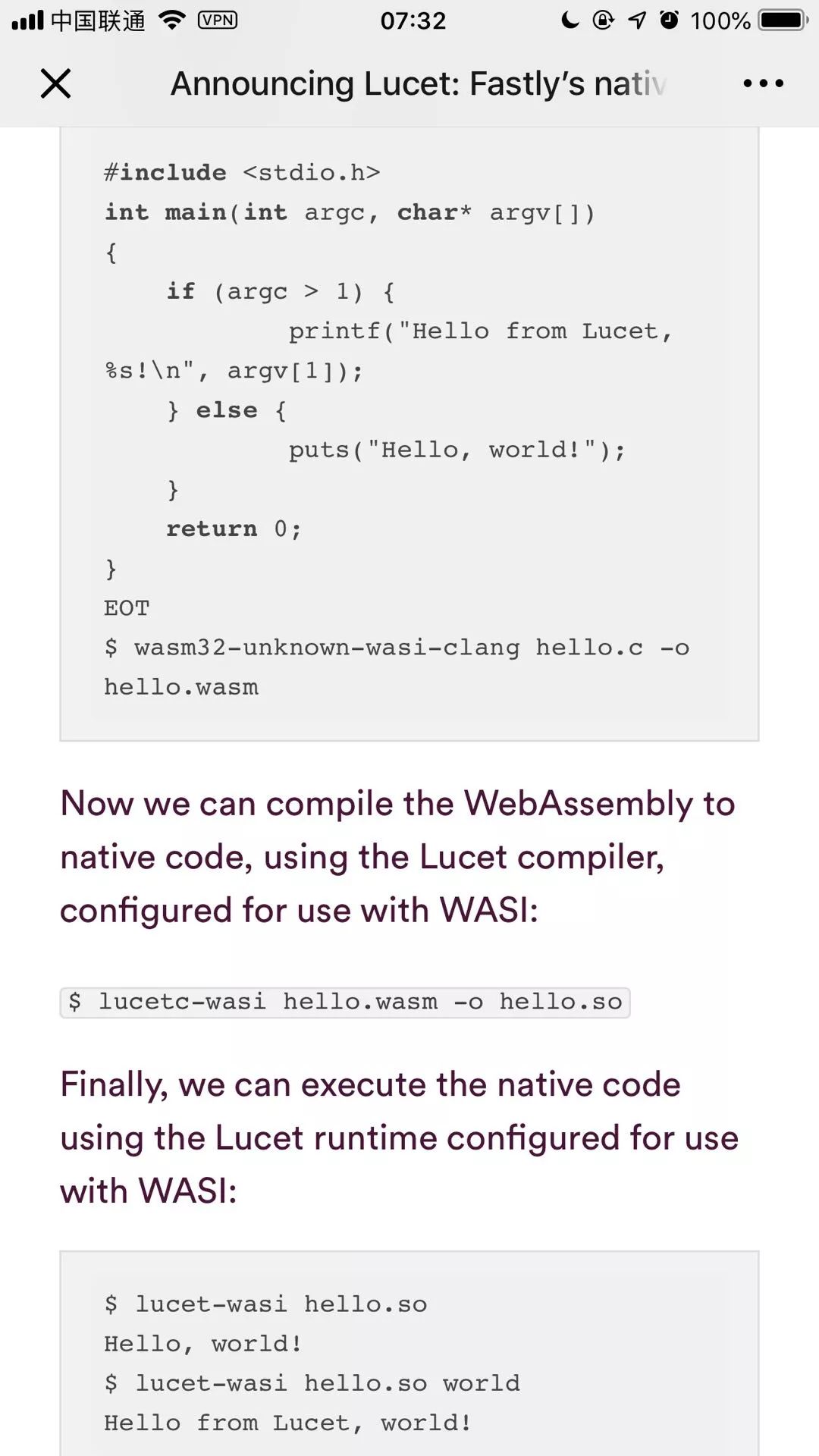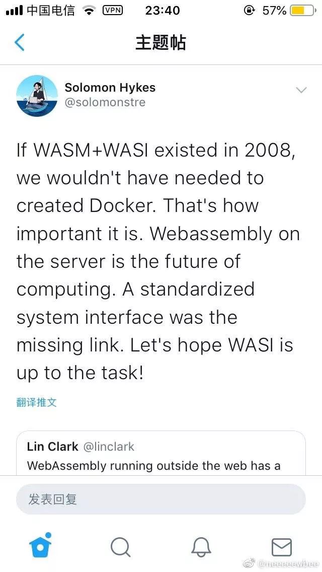 做边缘计算的 fastly 公司开源了他们的 lucet 项目,这是一个 WebAssembly 的编译器和 runtime。他们是想用 Wasm 来做一种轻量的容器来跑边缘计算程序。lucet 声称只需要 50 微秒,kilobytes 级的内存成本,而相对 V8 的 Wasm 引擎就需要 5 毫秒 和 megabytes 级别的内存。