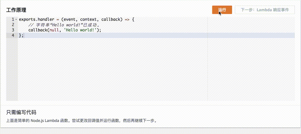 另外 AWS 的 lambda 文档页面有一个演示,我录制成动画,非常形象的介绍了 FaaS 的工作机制。
