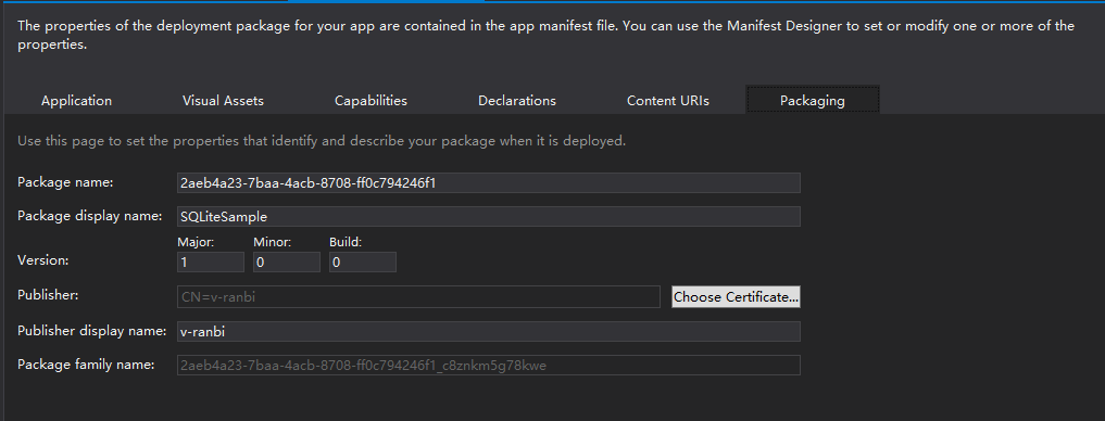 说了半天使用SQLite开发,那么我们创建出来的数据库究竟在存放在哪里呢?系统默认是放在这个路径的:C:\Users\(username)\AppData\Local\Packages\(packagename)\LocalState,其中username当然就不用小编解释了,当然就是您的用户名喽!packagename可以在工程目录里面的Package.appxmanifest文件里查看,如图: