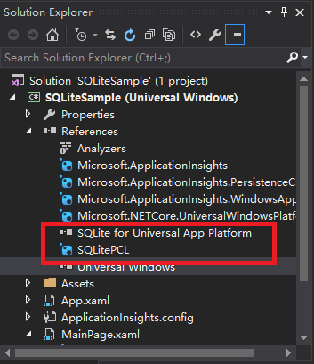 图中红色方块里圈出的部分,其中上面的是对SQLite的引用,下面的是对SQLitePCL的引用。