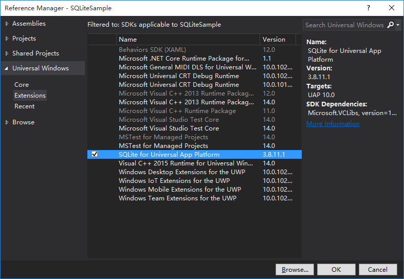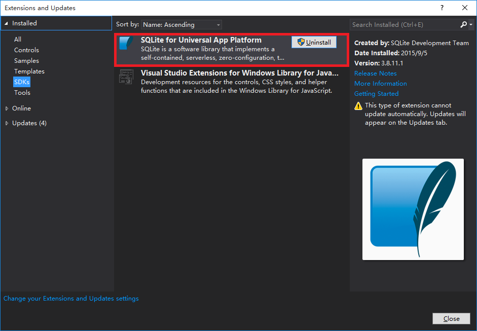 下载下来的是一个VSIX的安装包,安装后重启VS,选择Tools -> Extensions and Updates… -> Installed -> SDKs中,会看到SQLite for Universal App Platform,说明SQLite已经安装完成!!