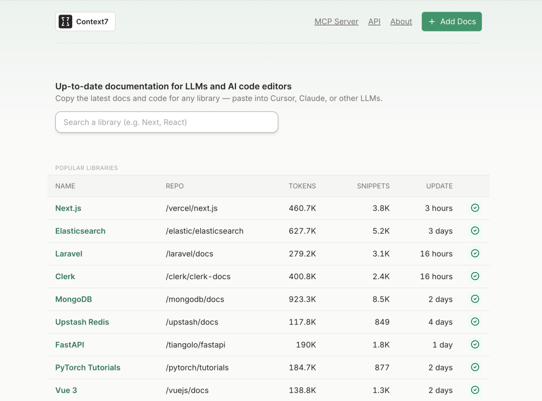 ✅ 最新、最准确的代码:获取反映最新库版本和最佳实践的建议。 ✅ 减少调试时间:减少因过时的 AI 知识导致的错误修复时间。 ✅ 拒绝代码幻觉:依赖于已记录的、存在的函数。 ✅ 精准版本:能根据你用的特定库版本给答案。 ✅ 无缝的工作流程:直接集成到你现有的 AI 编程助手中(如 Cursor、带有 MCP 扩展的 VS Code 等),无需频繁切换到文档网站。