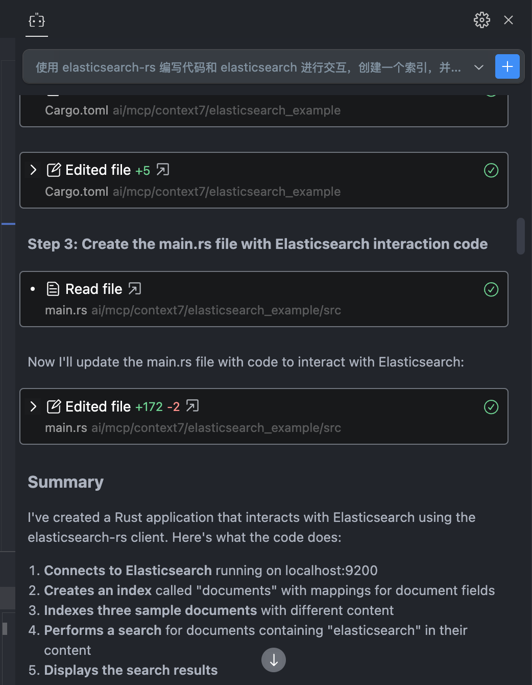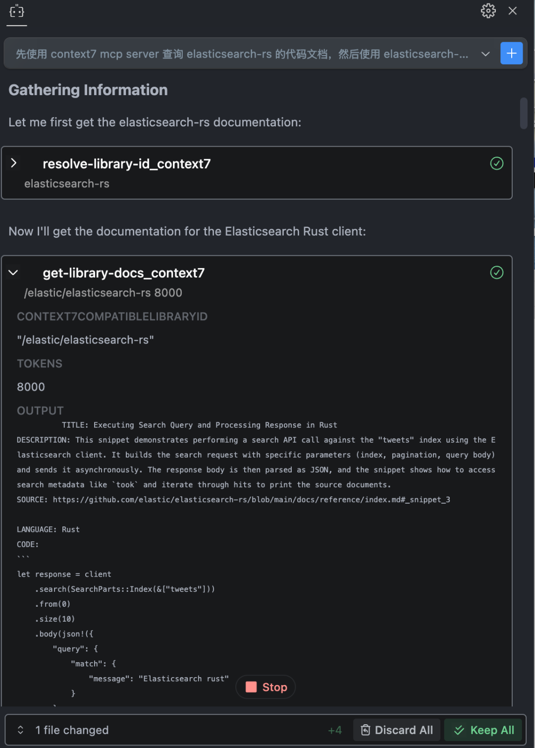从下图可以看到,Augment Code 首先调用了 Context7 MCP Server,获取了基于 elasticsearch-rs 库整理的提示词,然后根据最新的代码进行编程。