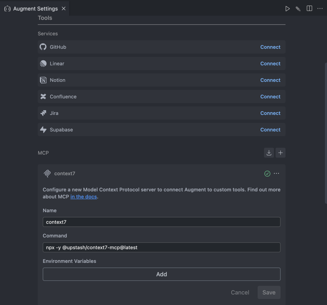 目前,常见的 AI 编程助手(如 Cursor、Windsurf、Augment Code 等)都支持配置 MCP Server。以我使用的 Augment Code 为例,只需要添加 Context7 MCP Server 的安装命令即可。