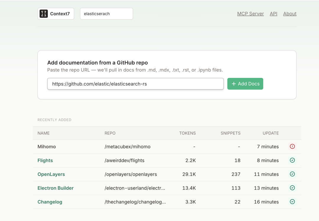 如果你想使用的库在 Context7 网站中还没有被索引,你可以手动添加。在本文中,我手动添加了 elasticsearch-rs 库。以后如果需要使用该库,就无需再手动添加了。
