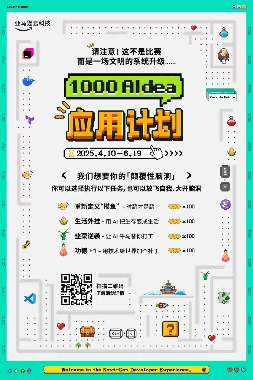 面对这场重构软件工程范式的革命,亚马逊云科技发起了「1000 AIdea应用计划」。向所有开发者发出邀请,开启通往下一代开发范式的全新旅程!从人类第一行代码诞生至今179年,技术的民主化演进从未停歇,如今,技术终于“开口说人话”了。现在,轮到我们用AIdea重新定义下一代开发体验,请不要看成一场比赛,我们期待每一个敢于探索、乐于创新的你,加入这场技术盛宴!