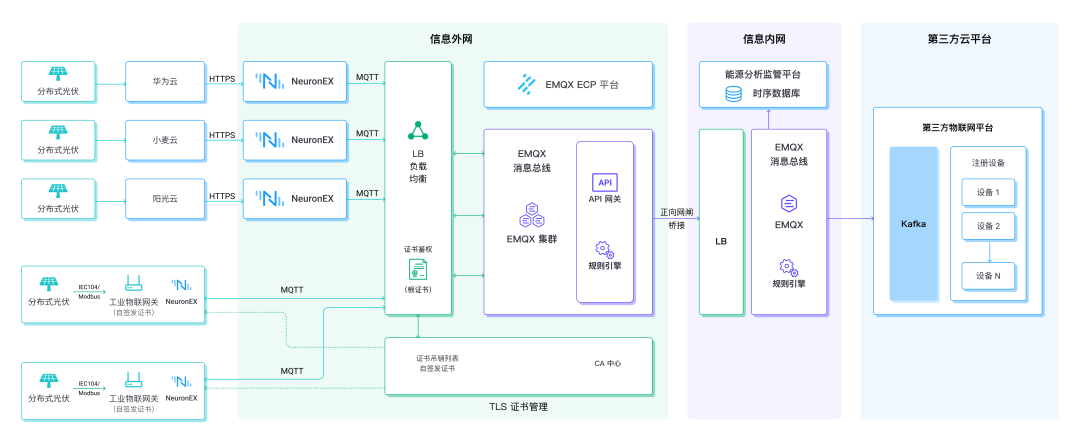 在光伏场站部署 NeuronEX 工业边缘网关,支持 100 多种常见的工业电力协议数据接入,轻松实现设备数据的采集并统一转换为 MQTT 协议上报至云端。数据上云的过程采用 TLS 双向认证方式,有效保障了设备接入平台的合法性以及数据传输的安全性和保密性。