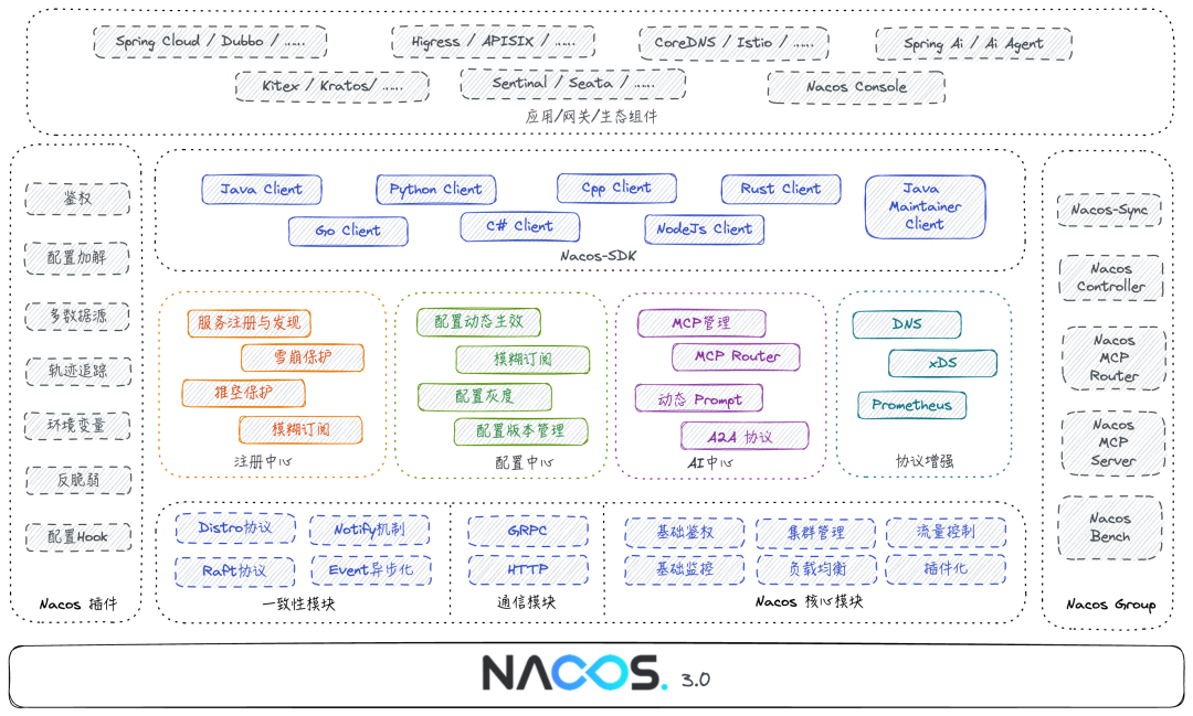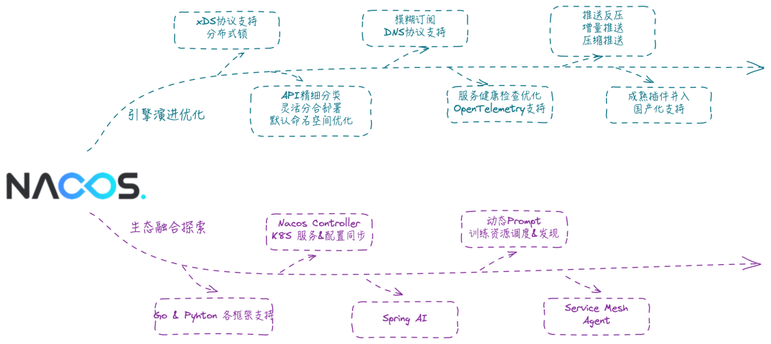 Nacos 3.X 计划为模型推理服务(如 MCP Servers 或 Agent to Agent)提供实时参数配置,服务注册与发现,版本控制,支持将存量 API 转化为 MCP 或 A2A API,降低 AI 应用的开发和管理成本。另外 Nacos 3.X 计划无缝对接 AI 应用平台(如终端应用运行时、算法优化工具链),提供 MCP 工具的路由、筛选等能力,降低AI应用依赖的成本和使用门槛。在 Nacos 3.0 的发展路线图中,对于 Nacos 基础架构能力持续提升,我们将继续致力于提升易用性与普适性,以满足用户日益增长的需求。在引擎自身方面,新版本计划支持 DNS 协议,以进一步拓展 Nacos 在支持较弱编程语言场景中的适用性。另外对于服务健康检查体系,我们将优化相关机制,通过将健康检查与服务类型解耦,提供更多关于服务可用性的判断依据,这将使微服务之间的流量调用更加灵活,同时确保系统的稳定运行。最后对于社区中已经比较成熟的插件,我们会将其纳入 Nacos 的主干仓库中进行维护,诸如 PostgreSQL 插件、AES 配置加密插件等,让这些插件在后续版本中随引擎一起发布、不需要再独立构建引入。在生态建设方面,我们将通过 Nacos Controller 的快速迭代,实现 Kubernetes 服务与配置的同步管理,从而使云原生环境下的使用变得更加便捷。为用户提供更加丰富的功能选择与应用场景,努力构建一个高效、灵活的分布式协调平台。Nacos 致力于帮助您发现、配置和管理微服务。Nacos 提供了一组简单易用的特性集,帮助您快速实现动态服务发现、服务配置、服务元数据及 AI 管理。