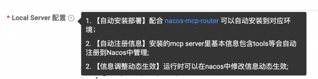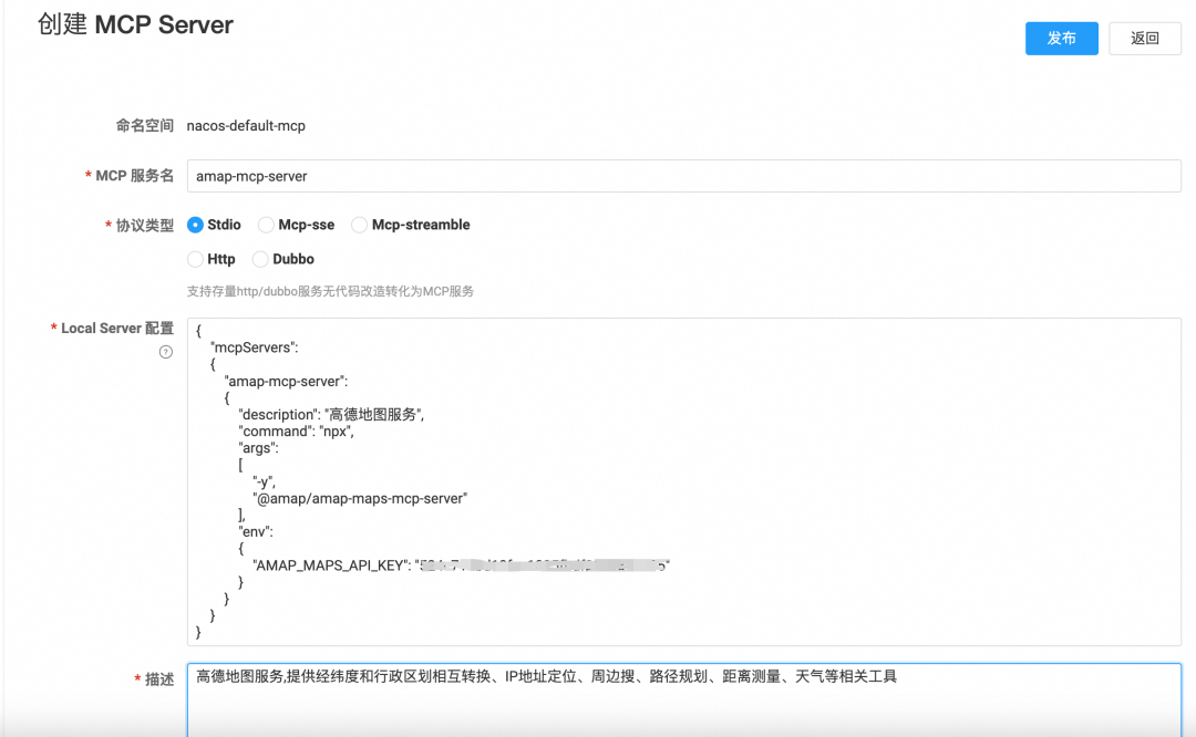 Nacos-MCP-Router 安装好后,可以路由匹配 Nacos MCP Registry 管理的 MCP Server(Remote 、Local 、代理服务),上边章节介绍了,主要是 Remote MCP Server 以及存量服务转换成 MCP Server 的注册场景,下边介绍 Local MCP Server 场景,Nacos-MCP-Router 对 MCP Server 的搜索、分发、部署、使用的整体流程;1. 在 Nacos 控制台 MCP管理 Tab 页,点击"创建 MCP Server"2. 服务名填写 amap-mcp-server,选 stdio 协议,填写高德官方 MCP Server 配置,以及 MCP 描述,最后,点击“发布”。3. 使用 Nacos-MCP-Router 发现和使用其他 MCP Servera. 根据任务描述搜索可用的 MCP Server,Nacos-MCP-Router 给出可用 MCP Server 列表b. LLM 选择使用高德地图 MCP Server,并调 add_mcp_server 工具初始化,如果需要安装,在这部 Nacos-MCP-Router 会自动安装c. LLM 通过 Nacos-MCP-Router 使用高德地图 MCP 工具得出最终结果整体过程中,AI Agent 只配置 Nacos-MCP-Router,就可以对 Nacos MCP Registry 所有 MCP 服务进行按需使用;