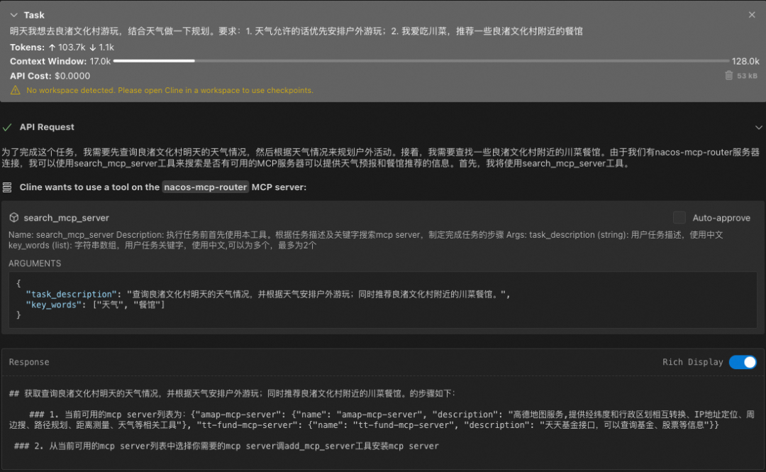 在使用 Nacos MCP Router 的场景中,如果 AI Agent 需要的 MCP Server 没有部署,当前 MCP 需要安装的话,Router 也会自动帮助安装,并且会向 Nacos 自动注册信息,Nacos MCP Registry 可以动态管理信息,管控调整动态可以生效;避免了使用官方 MCP Server 匹配不准,信息没有办法进行调整的问题,Tools 列表没办法动态关闭和开启的问题;