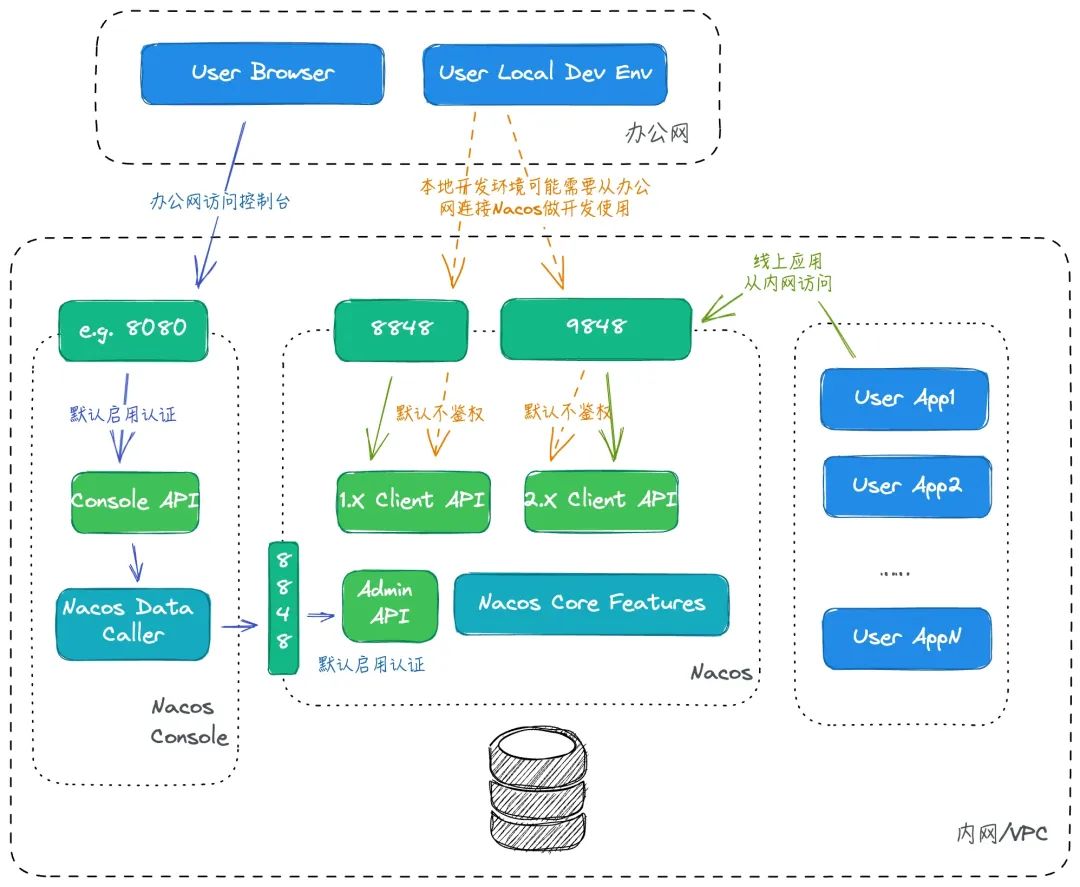 在之前的 Nacos 版本中,为了方便用户的部署和使用,控制台与引擎程序一直合并部署,且共用同一个端口。这种方式虽然增强了使用的便利性,但也带来了一些安全风险。此外,由于控制台和引擎在使用场景上存在差异,它们对于开放网络访问范围及安全认证需求的预期也不尽相同。基于此,Nacos3.0 中对控制台和引擎的部署架构进行较大调整。在 Nacos 3.0 中,控制台将独立在一个 Web 容器中运行,允许用户设定独立的访问端口。这一改变使得 Nacos 集群的运维人员能够更灵活地配置网络访问控制列表(ACL),例如,仅将控制台端口开放给办公网络。同时,配合控制台默认启用的安全认证,这将显著提高 Nacos 的安全性。此外,独立的 Web 容器还将与全新的 Admin API 相结合,实现控制台和引擎节点的灵活拆分部署,使得它们能够在不同节点上运行,增强安全性。