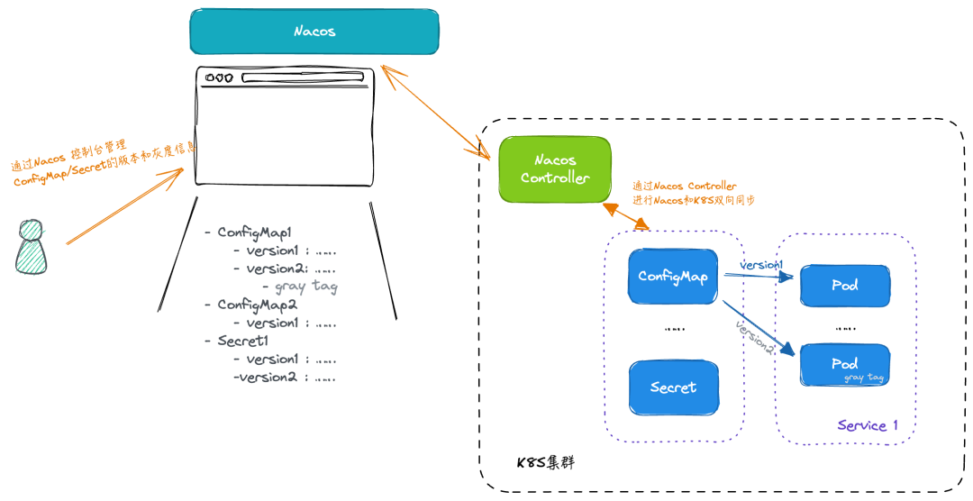 Nacos 作为微服务领域的注册配置中心,被越来越多的开发者使用,也与多种开发框架集成,大大方便了开发者。但目前仍然有一些场景没有满足。1. 有些用户可能同时使用了 Nacos 服务发现与 K8s 服务发现,使用 Nacos 服务发现的应用希望能够通过 Nacos 发现 K8s 集群的服务;2. 应用目前使用 K8s 的 configmap 和 secret ,很方便的通过 Nacos 管理 configmap 和 secret,支持配置加解密能力提升配置管理的易用性和安全性;2.1 Nacos 服务与 K8S 服务互相发现