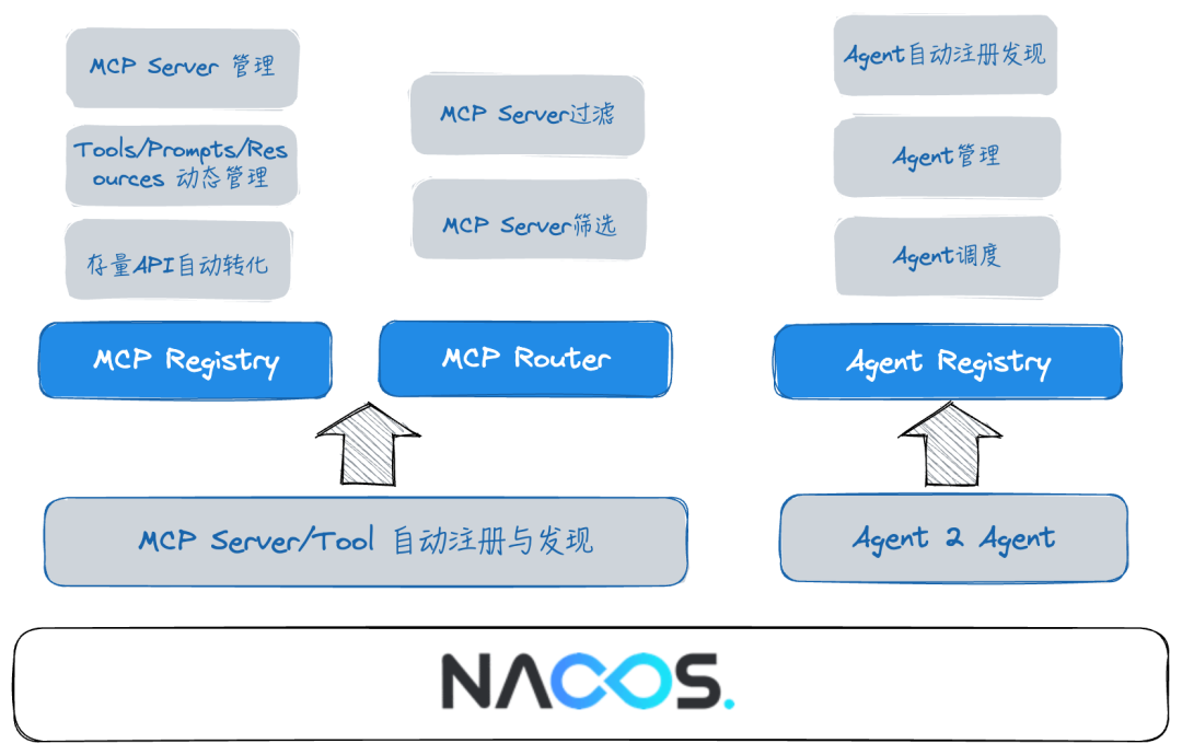 Nacos 3.X 通过强化 Python-SDK 的迭代和功能演进,提供无状态、高可用的参数分发能力,适配 Python(Langchain、Llamaindex)、Java(Spring-AI-Alibaba)、Go/Node.js 等多语言 AI 框架,用以支持 AI 相关参数的动态管理,例如:支持 LLM 模型参数(如权重、学习率、批大小)、Prompt 模板、特征选择、推理策略等动态更新,实现模型推理的实时调优(如 A/B 测试、流控、负载均衡)。同时动态管理 AI Agent 的任务规划、调度策略、联网参数及动态数据源,支持 Agent 实例的弹性扩缩容和全局状态同步,实现 AI Agent 运行时的动态能力增强。1.2 MCP/AI Agent Registry