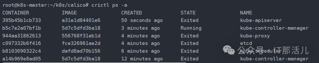 进而查看apiserver容器的状态,由于是基于containerd作为容器运行时,此时kubectl不可用的情况下,使用crictl ps -a命令可以查看所有容器的情况: