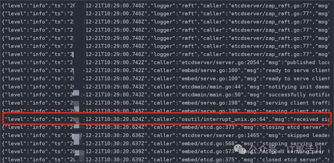但是,其中一行日志信息表示etcd收到了关闭的信号,并不是异常退出的: