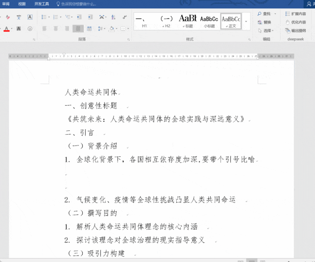 在word中只需要选择标题或者内容点击菜单按钮,内容就可以一键生成(动图
