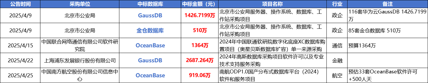 | 2025/4/3 | 天津市政府采购中心 | SeaboxSQL、GaussDB、UXDB、虚谷数据库、GreatDB、瀚高、GoldenDB入选 | / | 天津市2025-2026年度数据库管理系统框架协议采购项目 (项目 | 政企 | 天津市政府数据库框采结果公布! https://www.modb.pro/db/1910189135499898880 |