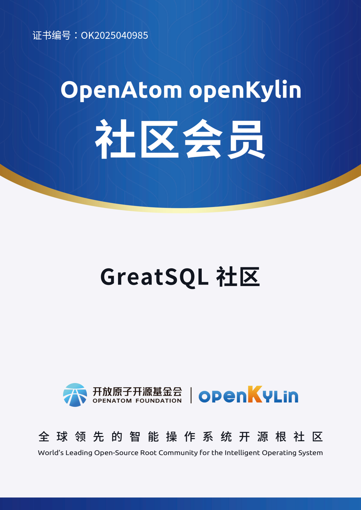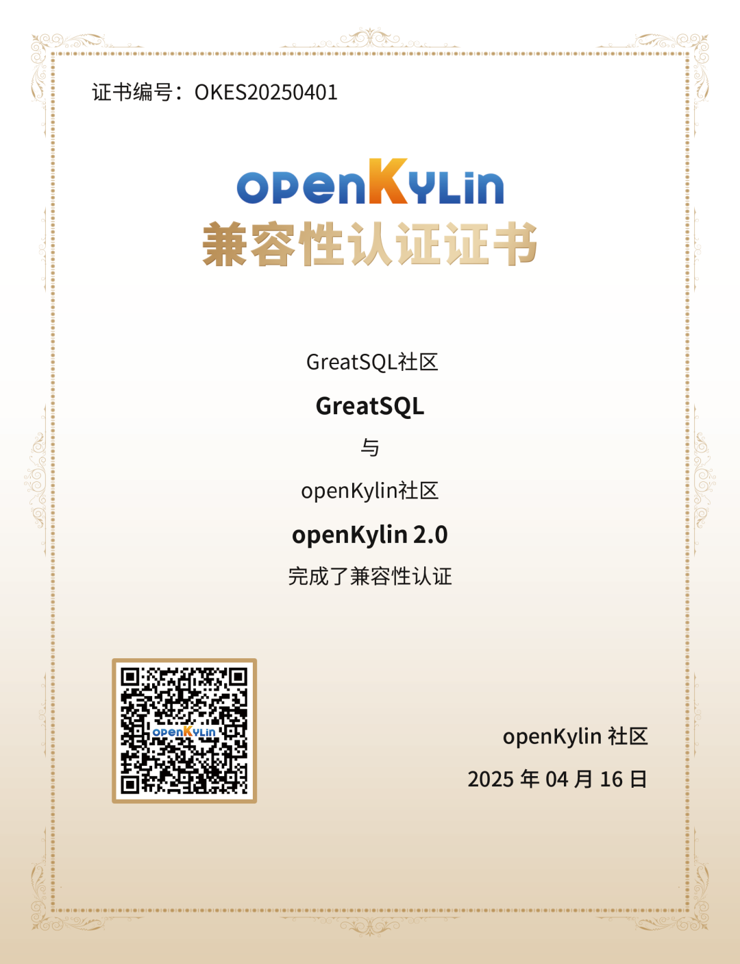 GreatSQL正式加入openKylin社区,成为其会员单位,未来双方将共同推动数据库与操作系统的深度适配与性能优化。与此同时,双方产品在技术团队的联合测试下,GreatSQL在openKylin操作系统上展现出卓越的稳定性与性能表现,尤其在金融级高并发场景下,事务处理效率提升显著,因此,GreatSQL与openKylin顺利完成兼容适配,并取得兼容性认证证书。