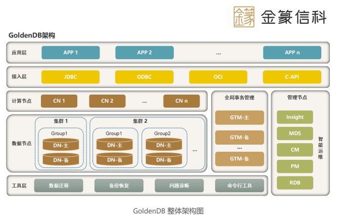 GoldenDB 是自主研发的数据库系统,整体由计算节点、数据节点、全局事务管理器、管理节点四种核心模块组成。外围包含数据迁移、备份恢复等运维工具。系统采用高可靠性设计,无单点故障。计算节点为无状态多节点部署,数据集群内由多个安全分片组构成,每个 安全分片组内数据节点主备多机部署,全局事务管理器主备多机部署。