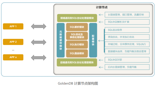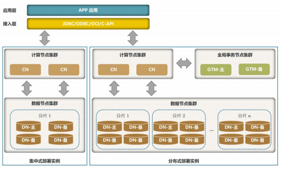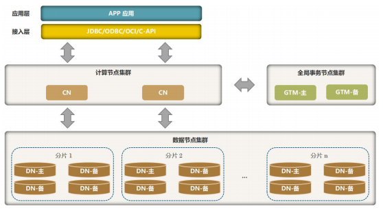 数据库由管理节点、计算节点、数据节点和全局事务管理节点四个部分组成。各个节点无需共享任何资源,都是独立自治的通用计算机节点,之间通过高速互联的网络通讯,从而完成对应用数据请求的快速处理和响应。
