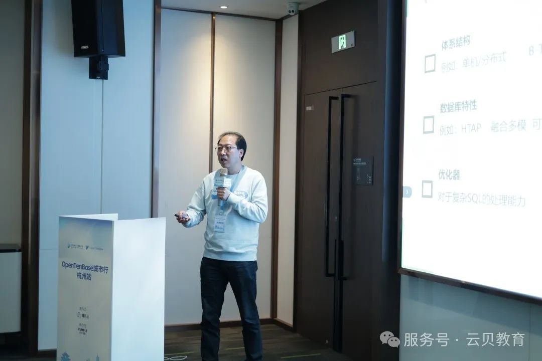 本次活动由陈老师担任开场致辞,《OpenTenBase 社区发展历程与展望》:陈琢老师在杭州站活动中回顾 OpenTenBase 发展,腾讯云捐赠开启生态共建,合并 TXSQL 内核注入技术基因,获多项荣誉。当下社区多元共治,在治理、技术、人才培育上成果丰硕。未来聚焦四大方向探索破局,呼吁各方携手推动国产数据库发展。