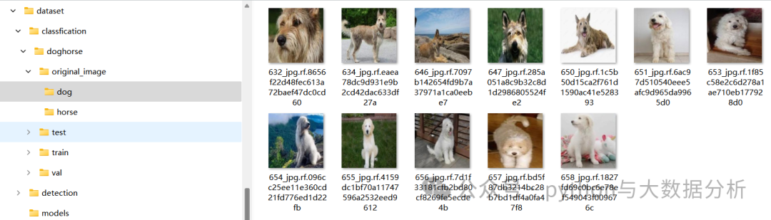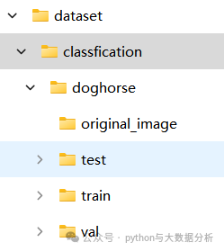 classfication 目标分类根目录└─doghorse 某分类数据集根目录├─original_image 原始图片文件夹├─test yolo默认测试集文件夹,系统可生成│├─dog 分类图片文件夹,系统可根据标签生成│└─horse 分类图片文件夹,系统可根据标签生成├─train yolo默认训练集文件夹,系统可生成│├─dog 分类图片文件夹,系统可根据标签生成│└─horse 分类图片文件夹,系统可根据标签生成└─val yolo默认验证集文件夹,系统可生成├─dog 分类图片文件夹,系统可根据标签生成└─horse 分类图片文件夹,系统可根据标签生成