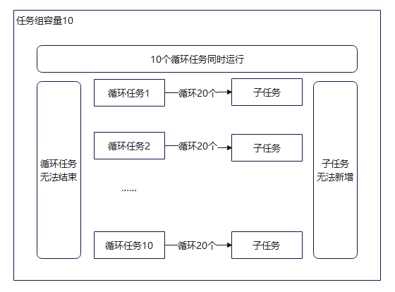 这就会导致超过10个循环任务同时执行时,循环任务因为任务组容量的问题,无法生成子任务,然后循环任务无法生成子任务,循环任务本身又不会结束,死锁了。