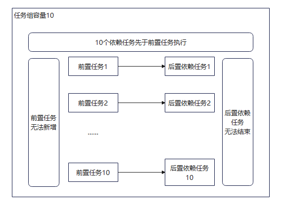 如果任务和前置任务的定时时间,设置反了,后置任务比前置任务先运行,那么当任务数量超过任务组容量时,就会导致依赖任务,一直等待前置任务,但是前置任务无法运行,死锁。