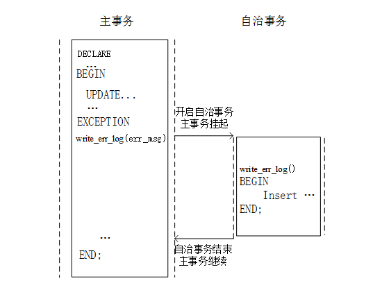 要想在应用程序中使用自治事务,需在程序声明部分使用PRAGMA AUTONOMOUS_TRANSACTION语句。自治事务的本质也是一个事务,所以自治事务可以commit和rollback。自治事务程序正常执行结束,自治事务内执行的所有的操作会被提交并持久化;如果自治事务抛出异常,那么主事务能够捕获其抛出异常,然后用户可能根据其异常进行相应处理。