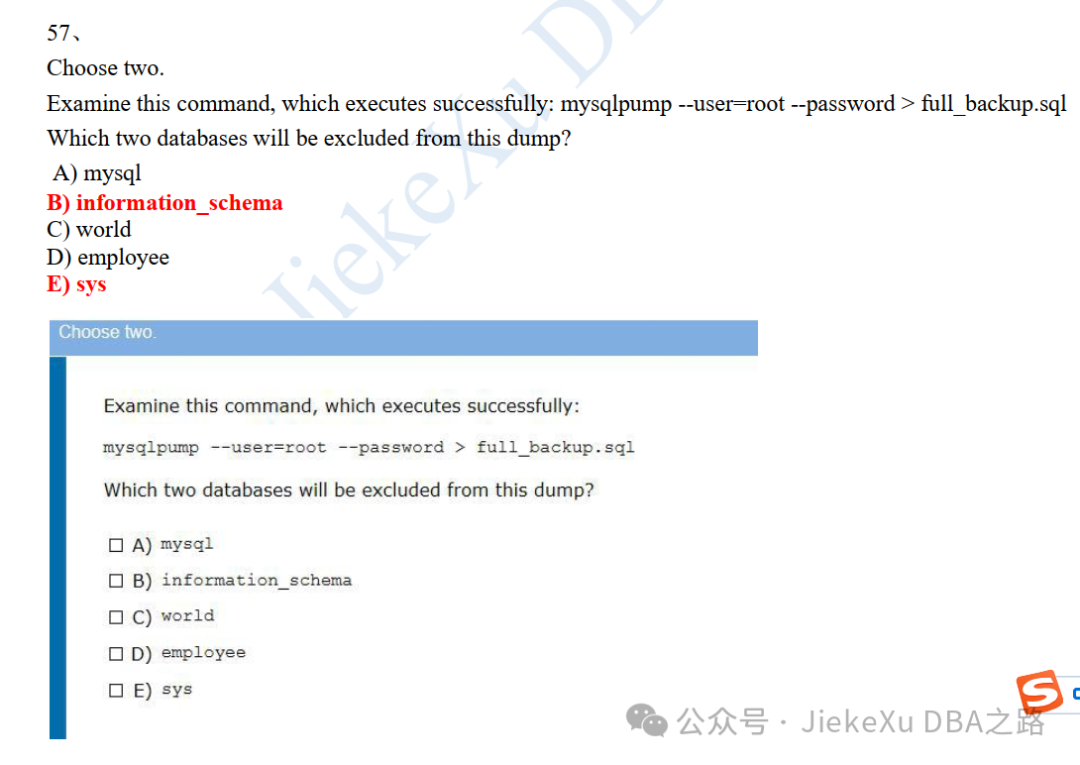 答案 BE https://dev.mysql.com/doc/refman/8.0/en/mysqlpump.html#mysqlpump-restrictionsmysqlpump does not dump the performance_schema, ndbinfo, or sys schema by default.mysqlpump does not dump the INFORMATION_SCHEMA schema.