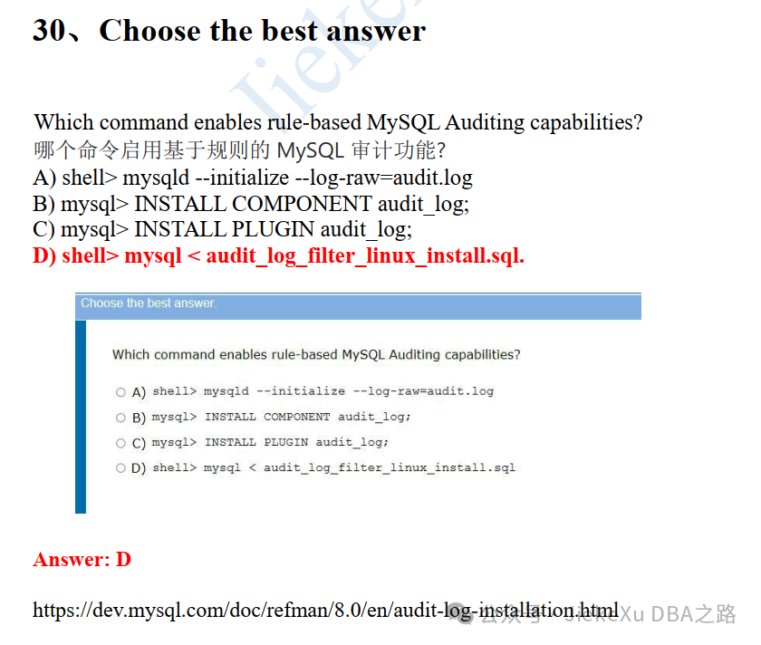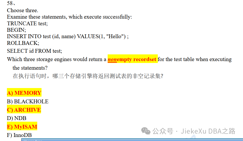 大家好,我是JiekeXu,江湖人称“强哥”,青学会MOP技术社区联合创始人,荣获Oracle ACE Pro称号,墨天轮MVP,墨天轮年度“墨力之星”,拥有Oracle OCP/OCM 认证,MySQL 5.7/8.0 OCP认证以及KCA、KCP、KCSM、PCA、PCTA、OBCA等众多国产数据库认证证书,今天和大家一起来看看 MySQL 8.0 OCP 考试题解析指南。欢迎点击下方“JiekeXu DBA之路”公众号名片可关注我的微信公众号,然后点击右上方三个点“设为星标”置顶,更多干货文章才能第一时间推送给你!后台回复【加群】,添加我个人微信拉你进群交流学习。