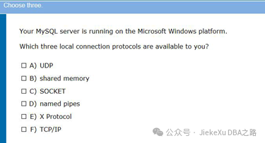 28、Choose three.Your MySQL server is running on the Microsoft Windows platform.Which three local connection protocols are available to you?您可以使用哪三种本地连接协议?A) UDPB) shared memoryC) SOCKETD) named pipesE) X ProtocolF) TCP/IP