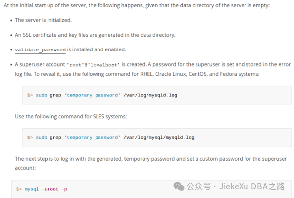 https://dev.mysql.com/doc/mysql-linuxunix-excerpt/8.0/en/linux-installation-rpm.htmlgrep 'temporary password' /var/log/mysqld.logmysql> ALTER USER 'root'@'localhost' IDENTIFIED BY 'MyNewPass4!';