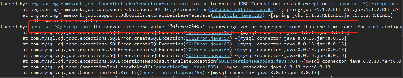 如果数据库连接写成spring.datasource.url=jdbc:mysql://localhost:3306/spring_boot ,由于MySQL版本的问题,可能会有以下的错误,在后面加上“?serverTimezone=GMT%2B8”,设置下时区,解决。